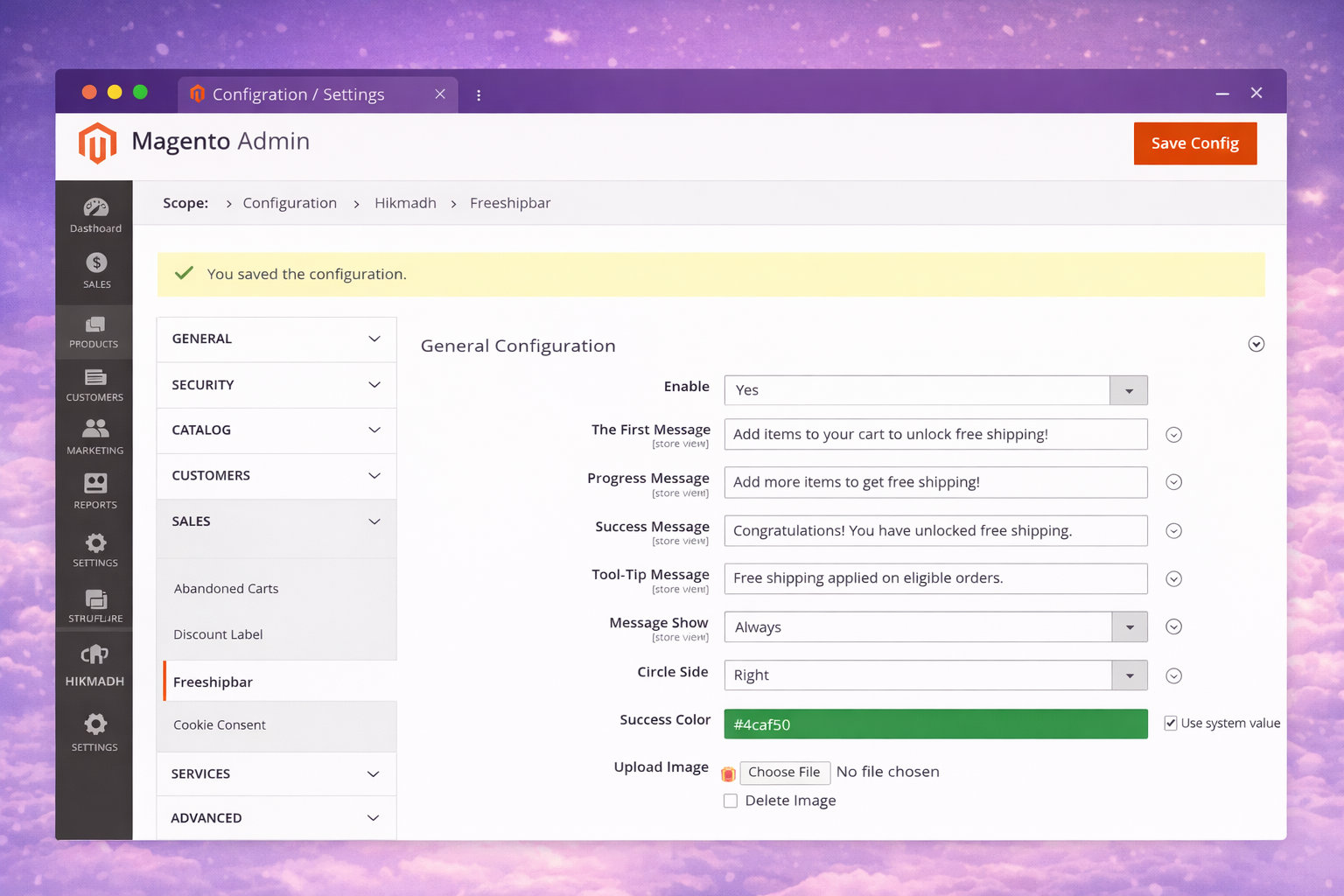 The Hikmadh Free Shipping Bar provides complete control over how the progress indicator behaves and appears on the storefront. All settings can be managed directly from the Magento Admin panel.