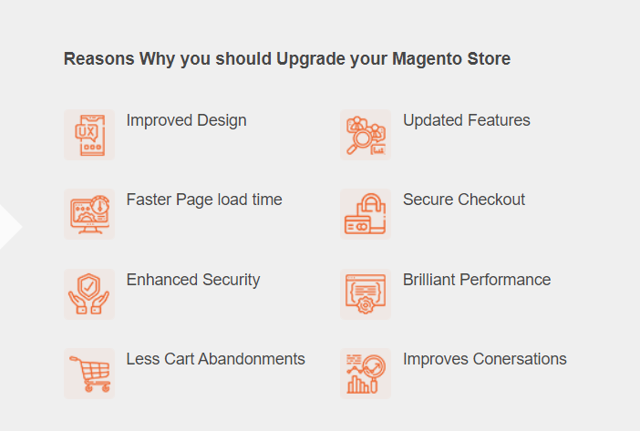 Upgrading your older Magento version to latest helps you to leverage new upgraded features, improved shopping experience, bug fixes, enhanced security, and frictionless store checkout to deliver amazing shopping experience to your buyers. That makes your store more stable and bug-free with increased performance compared to the past that reduces your cart abandonment and boost your sales respectively.